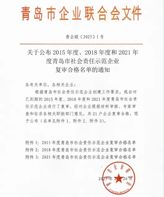 青岛市社会责任示范企业创建活动始于2013年,旨在不断倡导企业积极承担和履行社会责任,发挥先进示范作用,进一步促进青岛市经济的可持续发展,实现经济、生态及社会效益的和谐统一。“青岛市社会责任示范企业”称号有效期为三年,复审合格的企业将保持称号,到期再次复审合格后继续有效。
